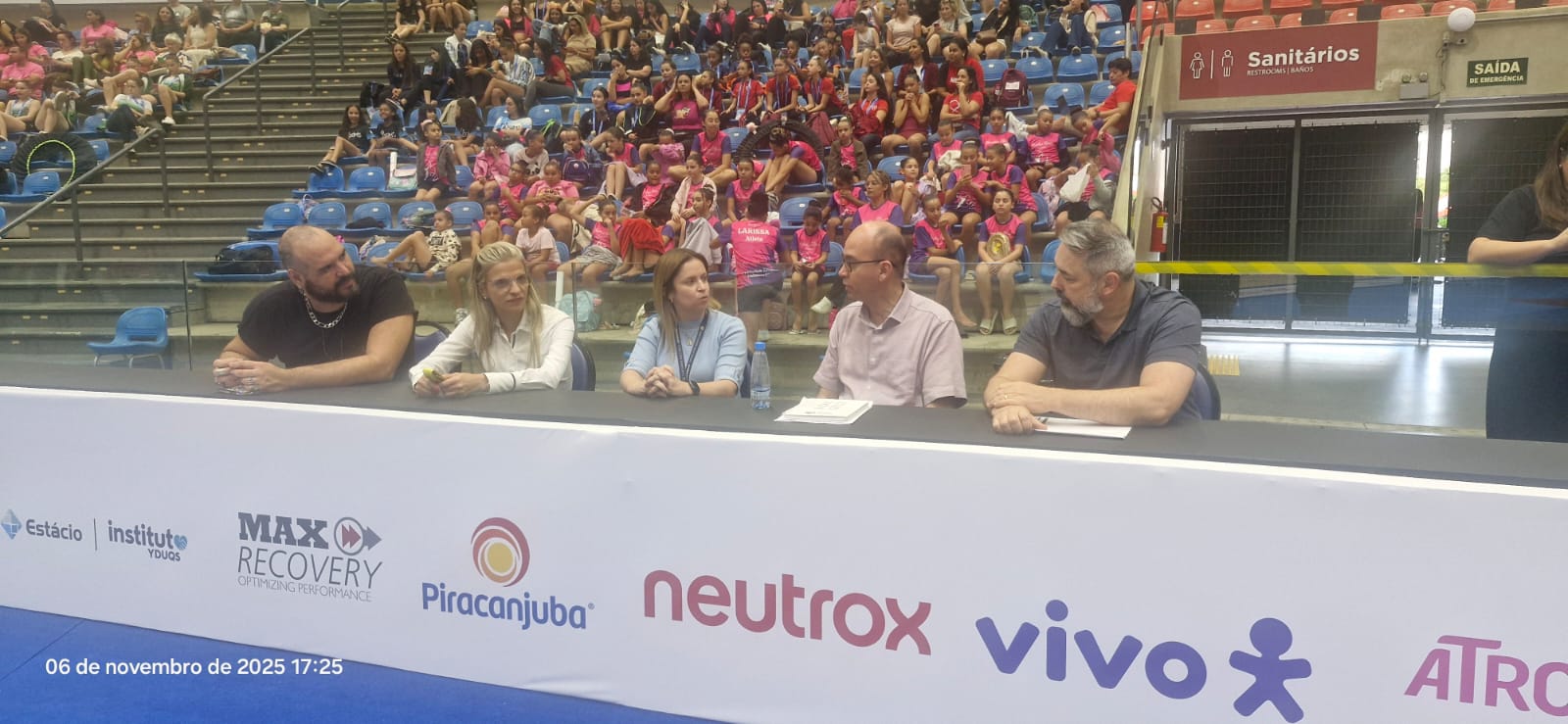 Na tarde desta quinta-feira, o Campeonato Nacional de Ginástica Rítmica contou com a presença do Ecônomo do Santuário Nacional de Aparecida, Padre Fabio Evaristo, e seu adjunto, Padre Adam, acompanhados pela gestora de eventos do Santuário, Aline Costa. Eles foram recebidos pela presidente da Federação Paulista de Ginástica, Adelita Andrade.
